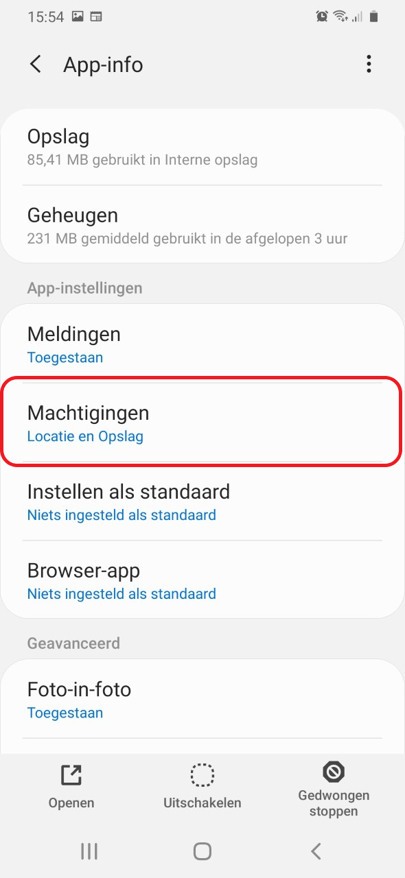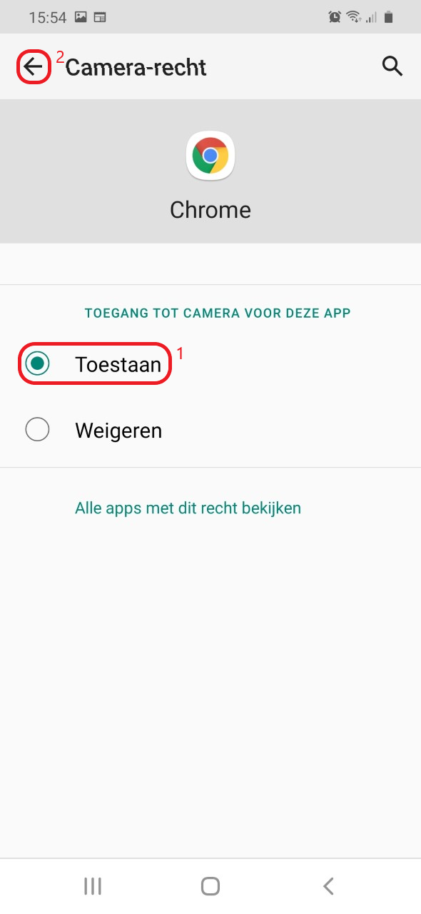 Open het kopje 'Camera' en zet de machtiging op 'Toestaan' en ga daarna terug naar 'Machtigingen'