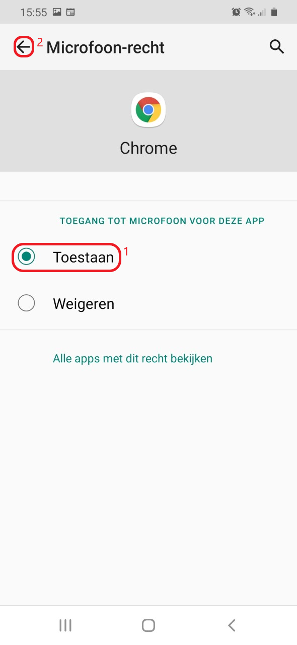 Open het kopje 'Microfoon' en zet de machtiging op 'Toestaan' en ga daarna terug naar 'Machtigingen'