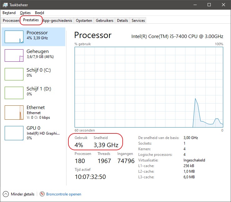 Kijk onder de kop 'Prestaties' naar de grafiek 'processor' voor het processor gebruik van de computer