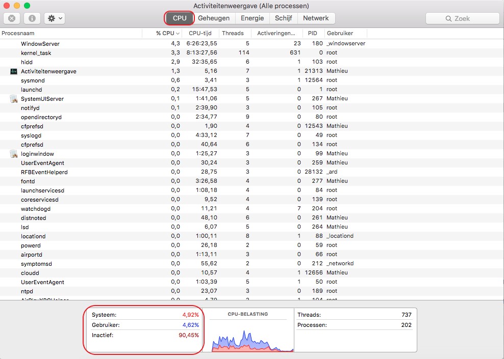Kijk onder de kop 'CPU' naar uw processor gebruik