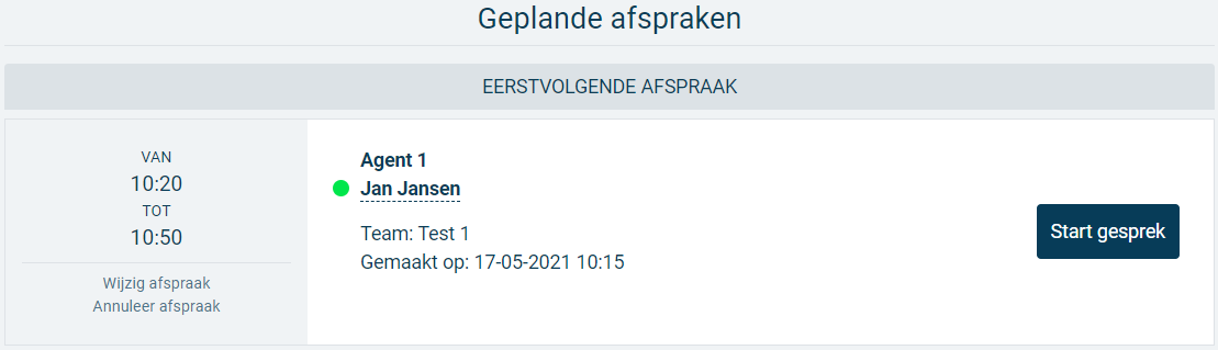 Het bolletje bij de afspraak wordt weer groen en de knop “Start gesprek” wordt weer actief.