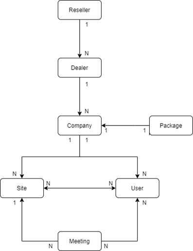 The Company-object represents a customer. Site and User-objects are linked to the company. A Package-object is linked to the Company-object, this package determines the product features that are available. The Company-object is always linked to a Dealer-object.